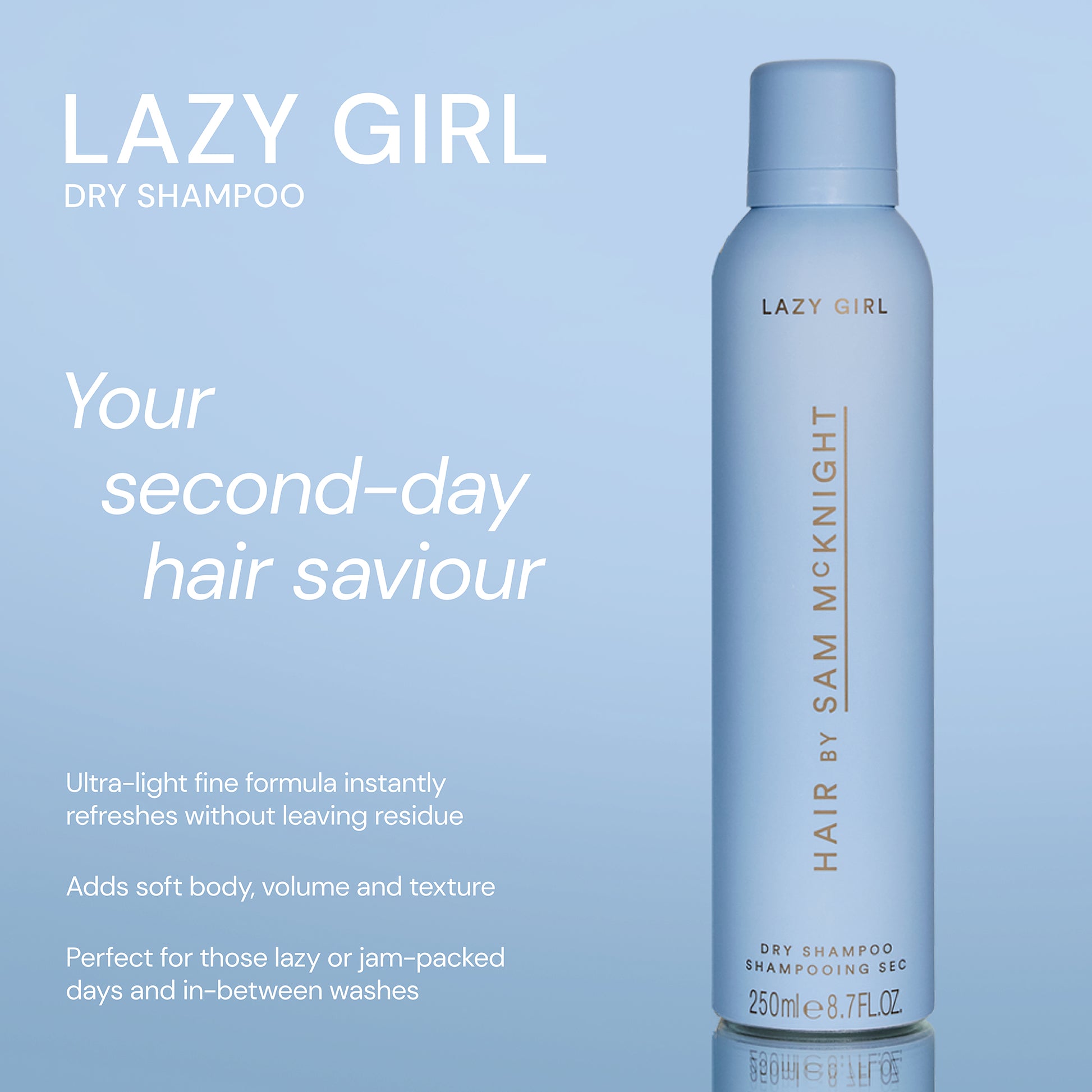 Lazy Girl Dry Shampoo etterlater håret silkemykt og er formulert med en botanisk duft inspirert av Sams hage, med noter av røkelse, einer og vannlilje, skapt i samarbeid med Perfumer H. Den er ideell for alle hårtyper og -teksturer og gir håret forlenget holdbarhet mellom vaskene uten å etterlate hvite rester.