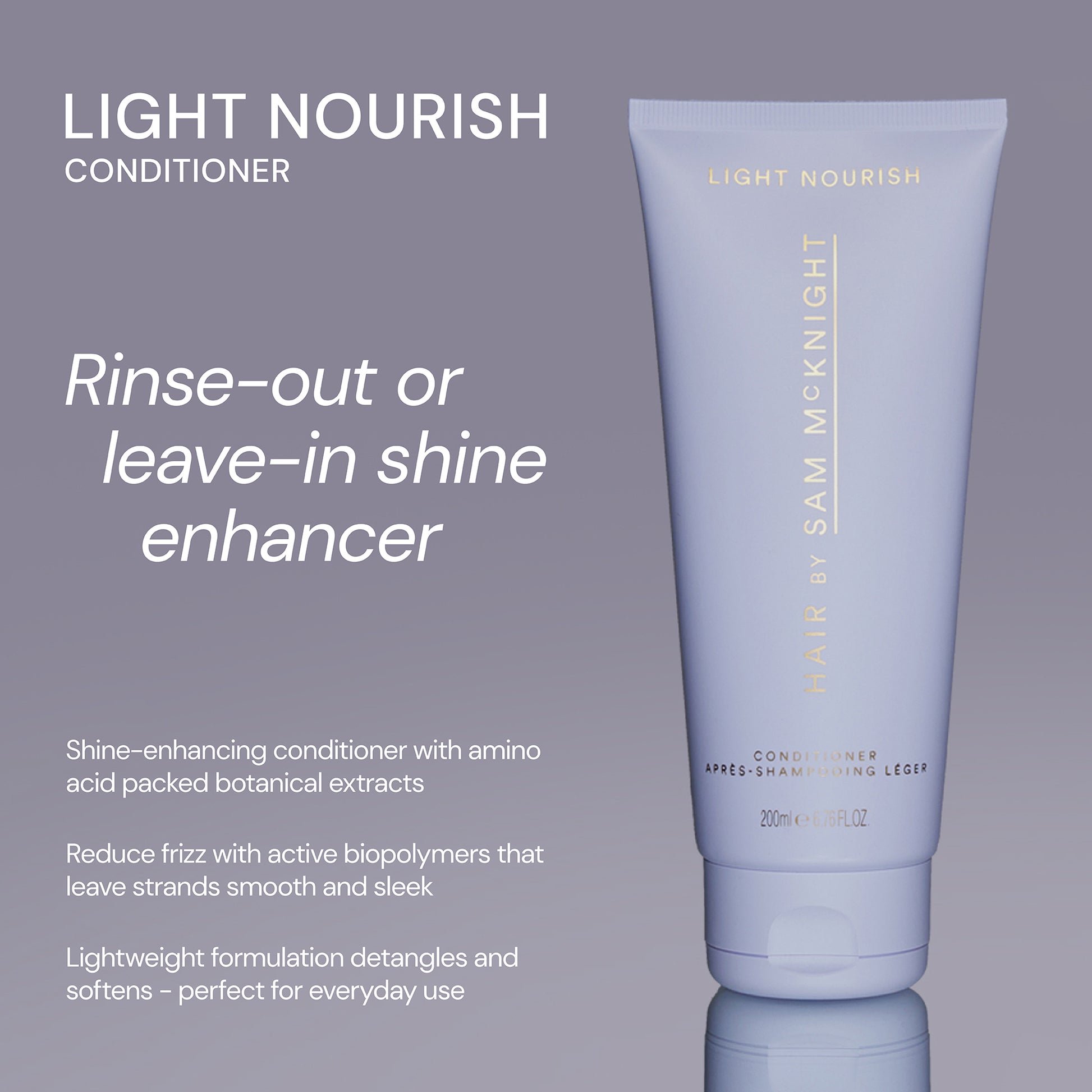Light Nourishing Conditioner inneholder aktive biopolymerer fra hydrolysert maisstivelse, som skaper en anti-frizz-barriere på hårets overflate og beskytter mot fuktinntrengning. Den er perfekt for alle hårtyper, inkludert hår som er utsatt for frizz eller som er spesielt fint. Samtidig tilfører Sam McKnights signatur botaniske duft – en sofistikert blanding av naturlige noter – en luksuriøs opplevelse til hårpleierutinen.