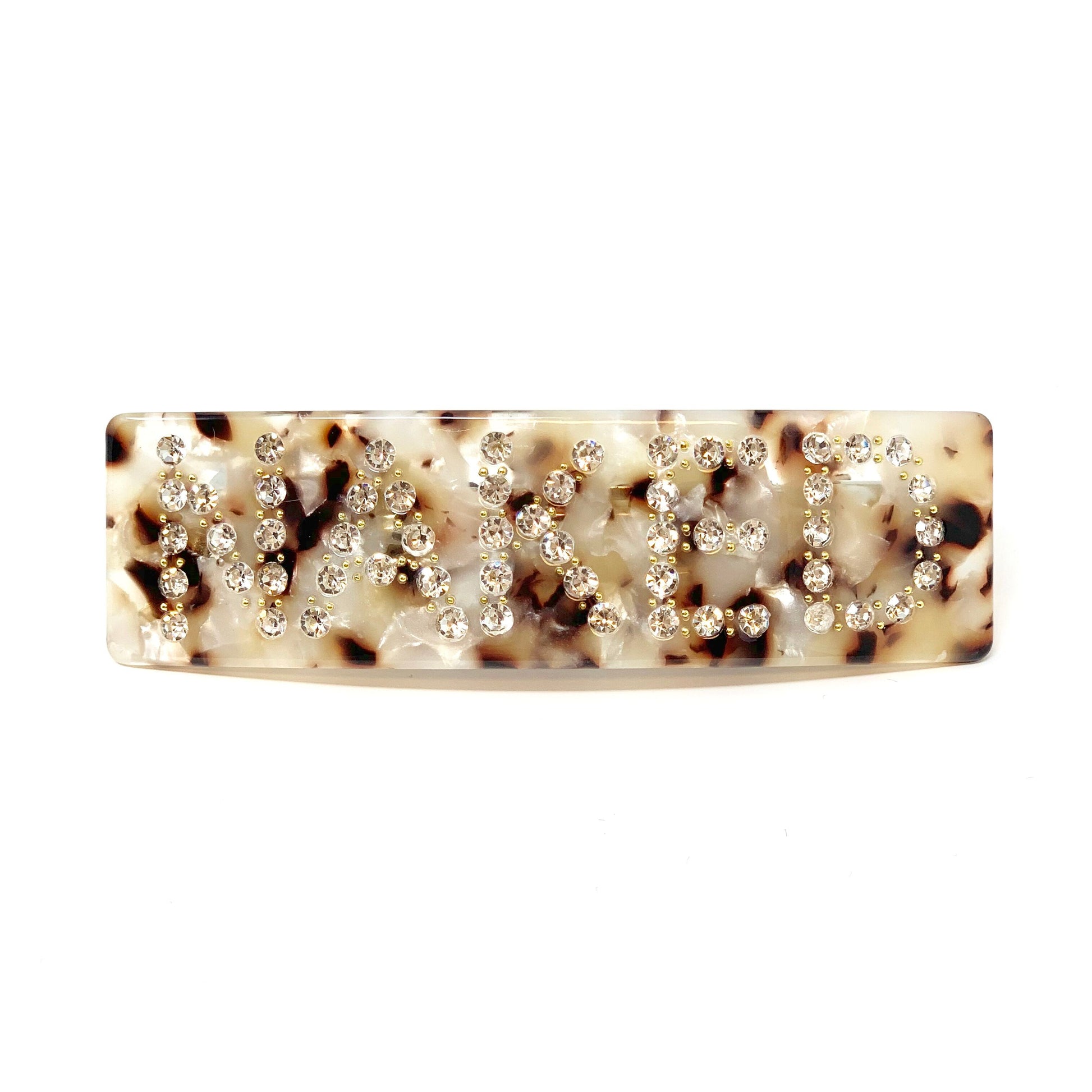 En vakker peaceOnyou hårspenne i farget skilpaddeskjellmønster med swarovski krystaller. Baksiden er av lær for å beskytte håret. Denne kommer i en mindre størrelse enn den originale hårspennen med bokstaver.