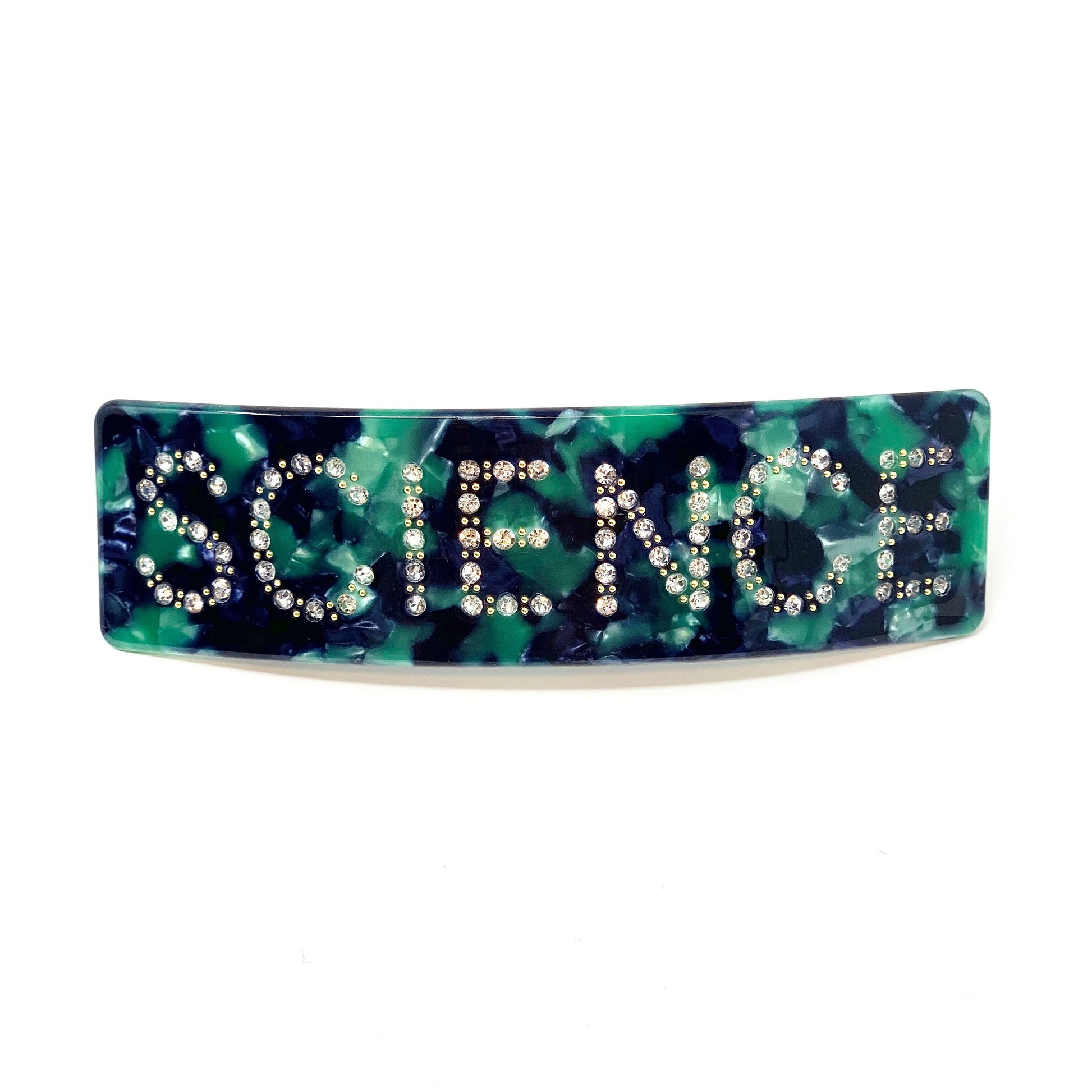 En vakker peaceOnyou hårspenne i farget skilpaddeskjellmønster med swarovski krystaller. Baksiden er av lær for å beskytte håret. Denne kommer i original størrelse slik den fremstår i forrige kolleksjon.